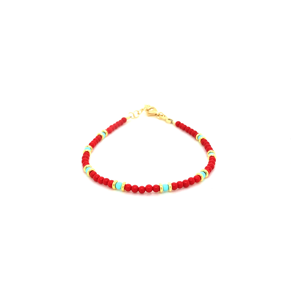 Srebrna zapestnica pozlačena z rumenim zlatom, ki je po dolžini prilagodljiva od 15,5 do 18,5 cm. Na zapestnici so korale in turkizi, Je poletna klasika in se lepo kombinira z ostalim enostavnim nakitom.