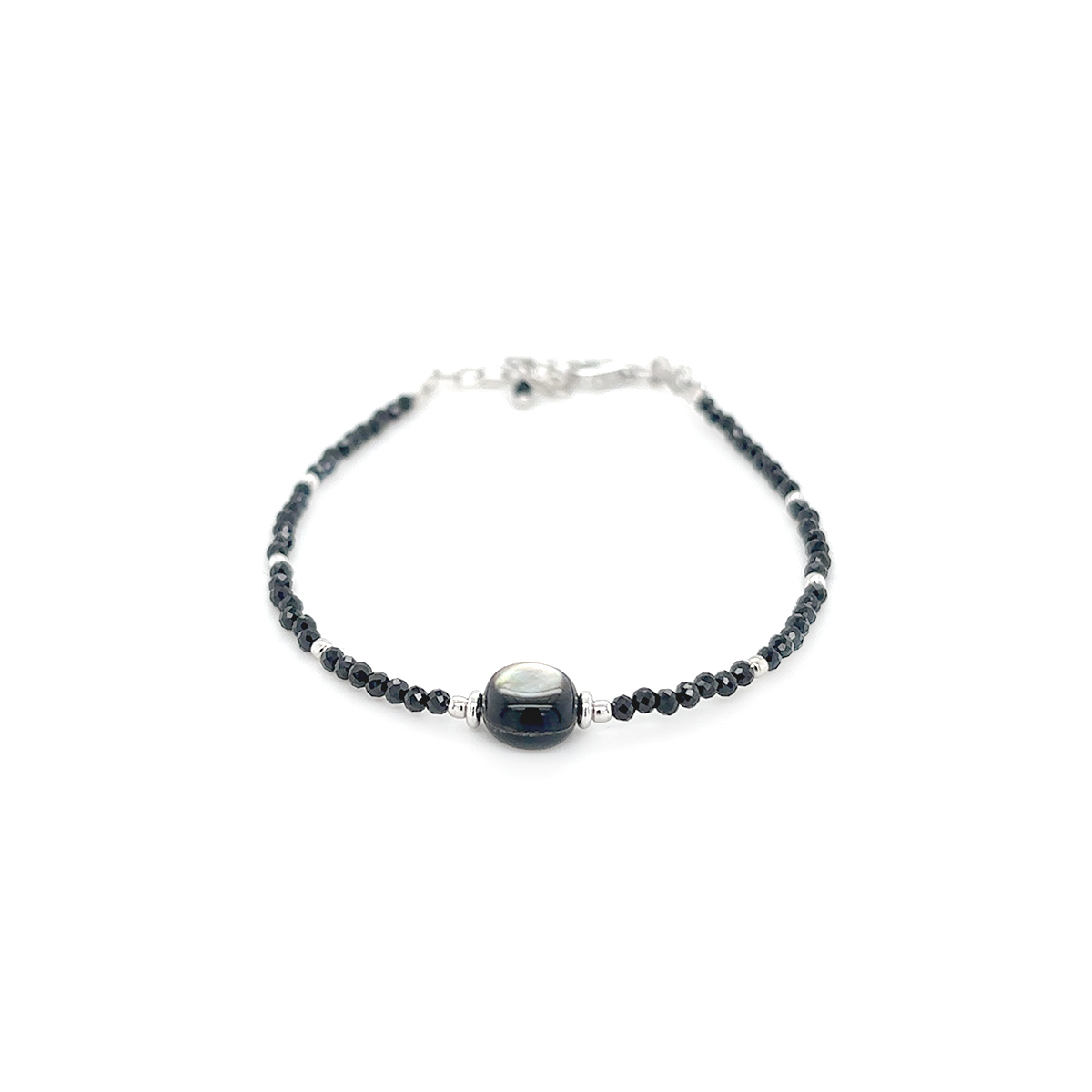 Srebrna zapestnica s sivim biserom in črnimi ahati, ki je po dolžini prilagodljiva od 15 do 18 cm. Zapestnica je zelo nežna in se lepo kombinira z verižico iz iste kolekcije.